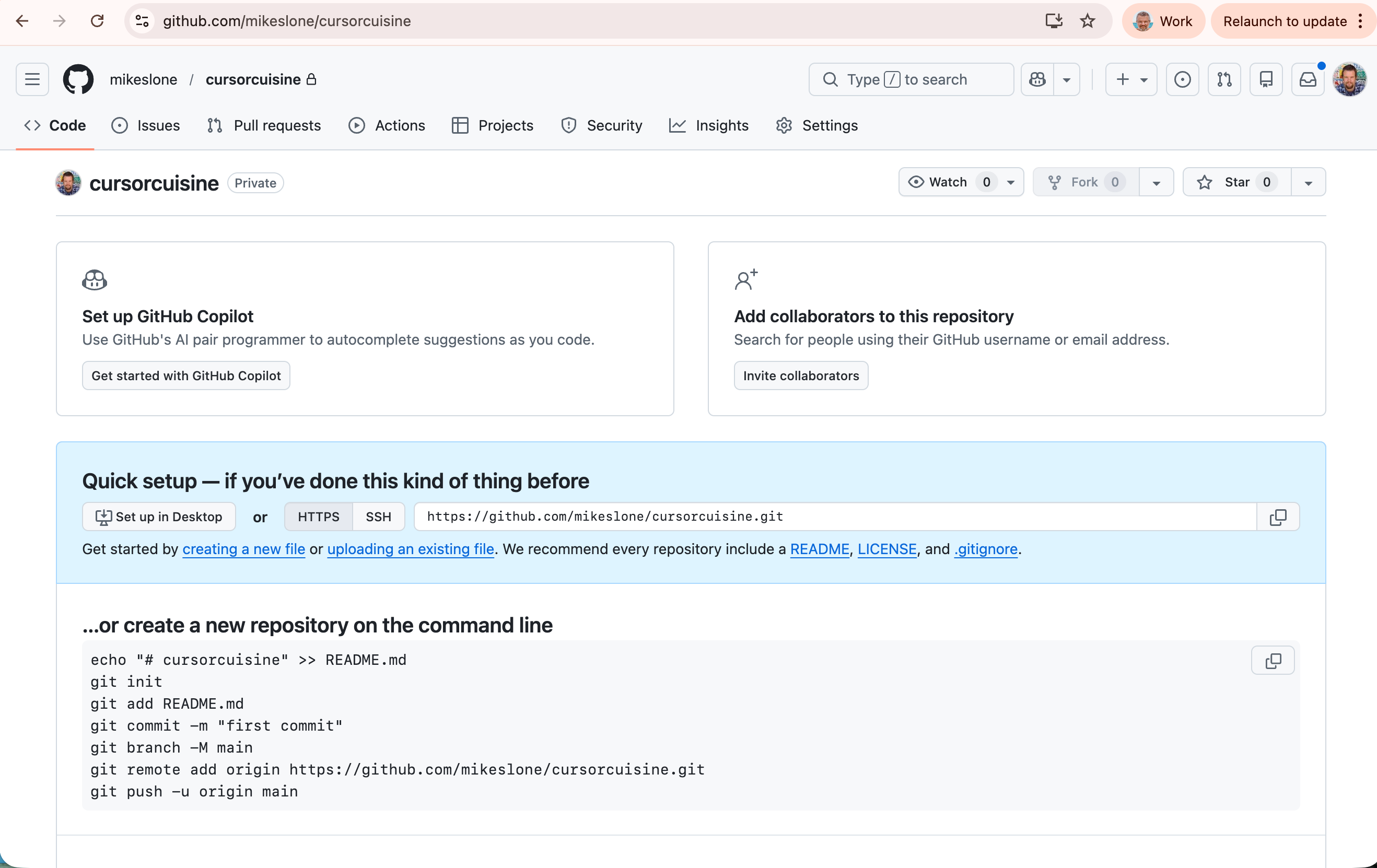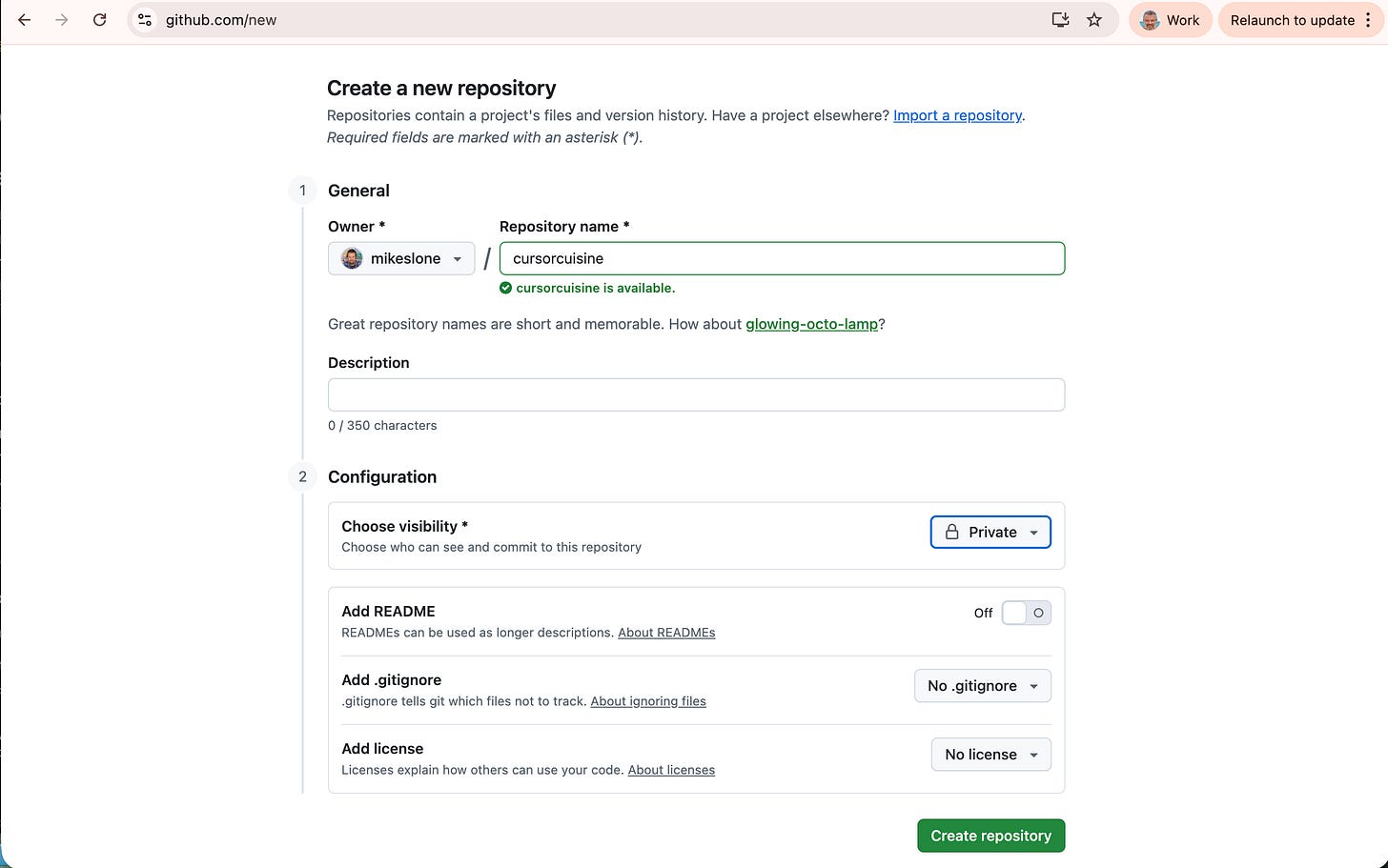 cursor-cuisine. Make it Private.Prompt Cursor: “Initialize a git repository and push this code to my new GitHub repo: [PASTE YOUR GITHUB URL].”