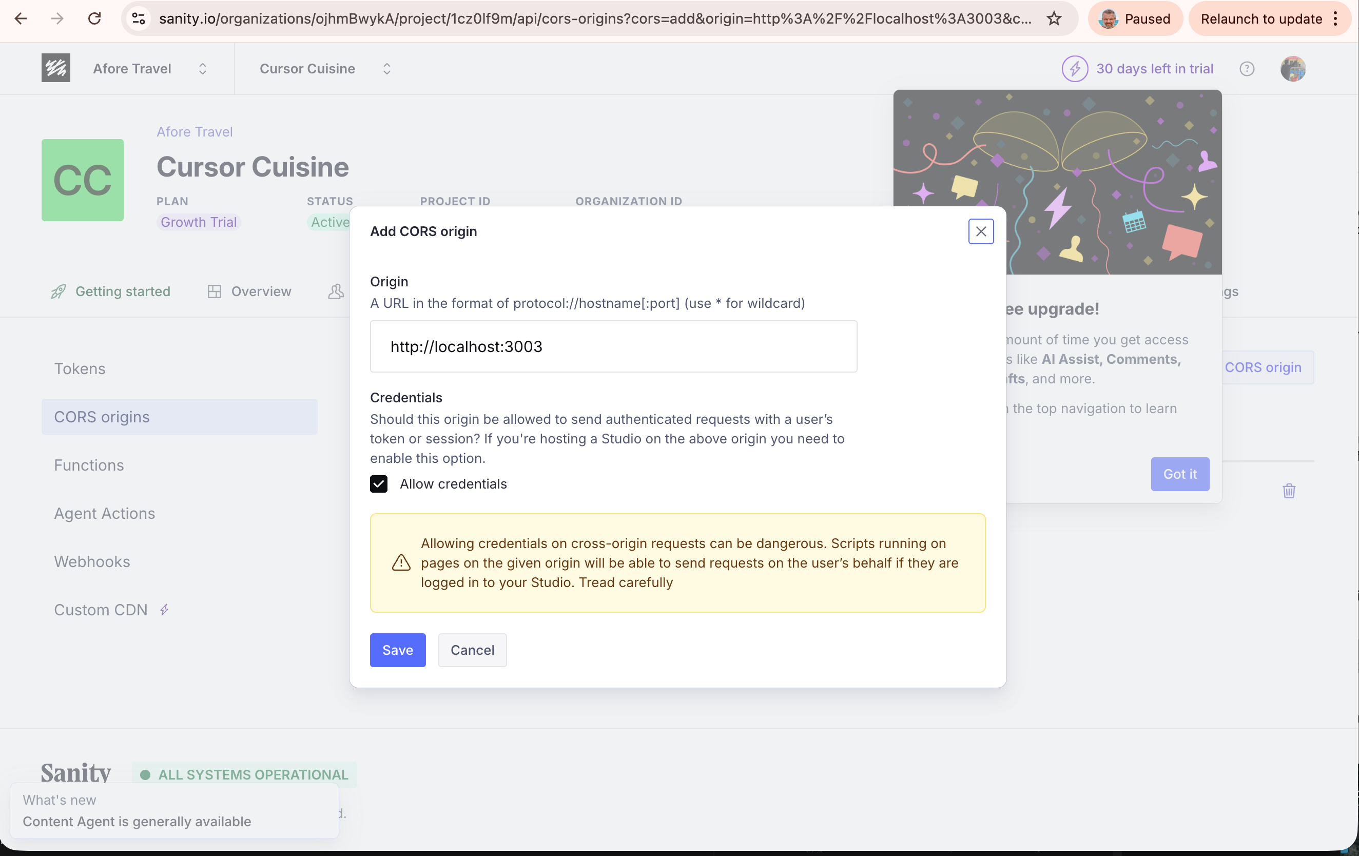 Click Add CORS Origin. Paste your localhost URL. Check “Allow credentials.