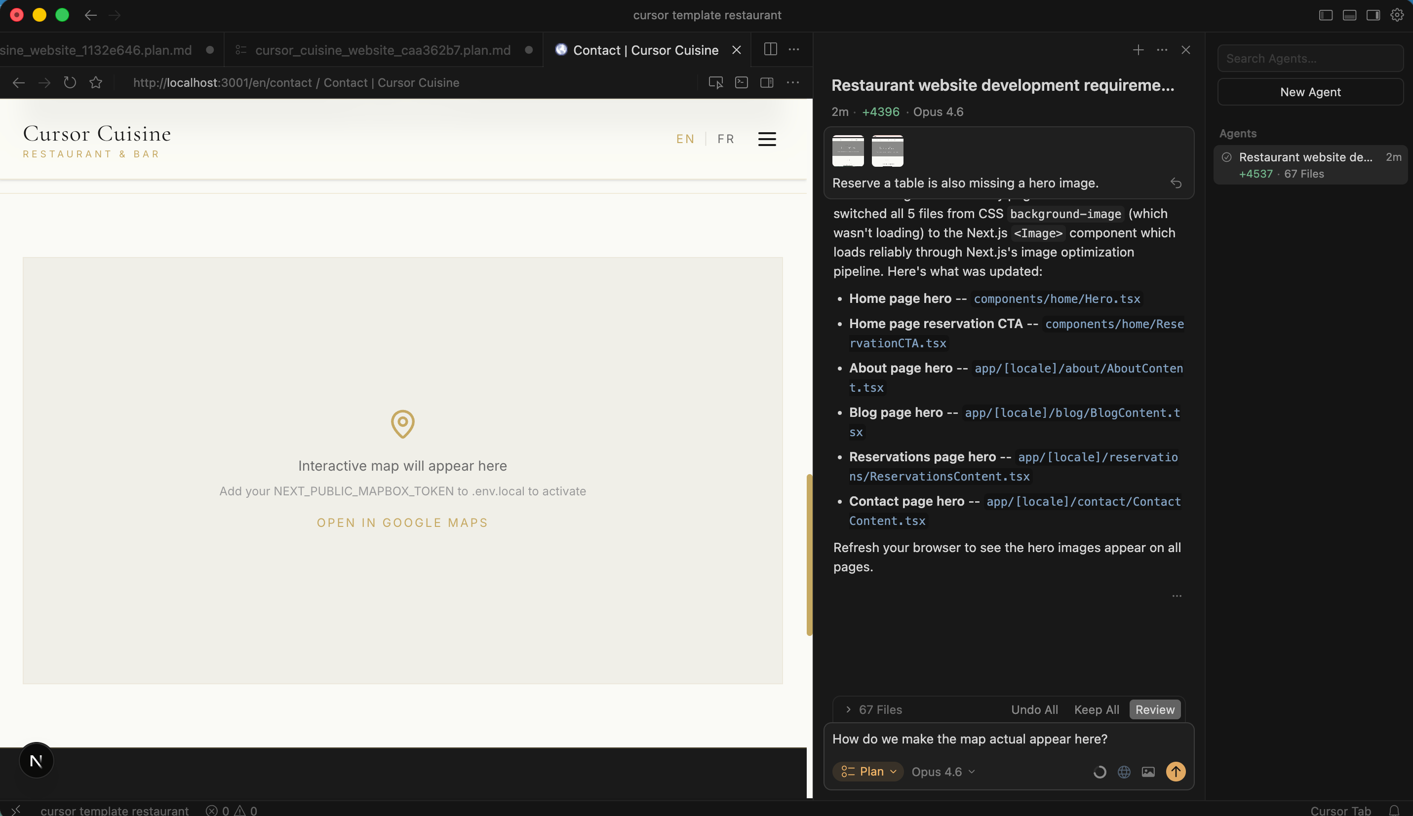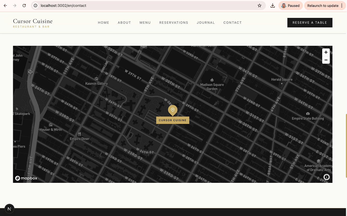 You’ll notice the map is probably blank. Cursor puts a placeholder there because it needs a Mapbox API Token.