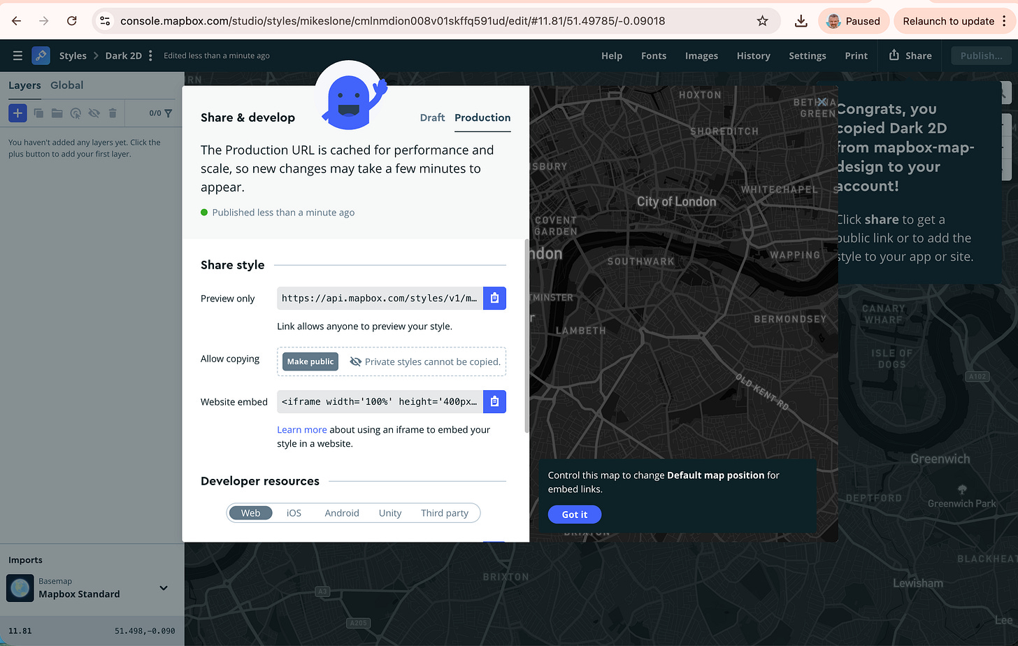 Prompt: “Here is my Mapbox token: [PASTE TOKEN]. Please make the map component work and center it on a fake location in New York”