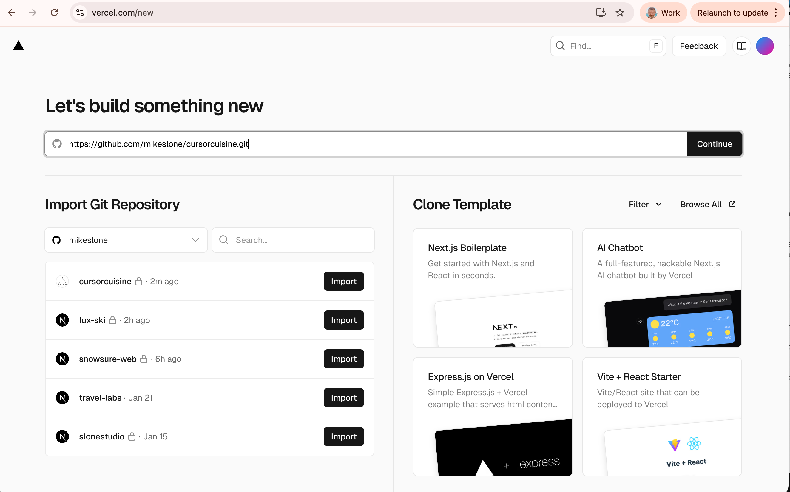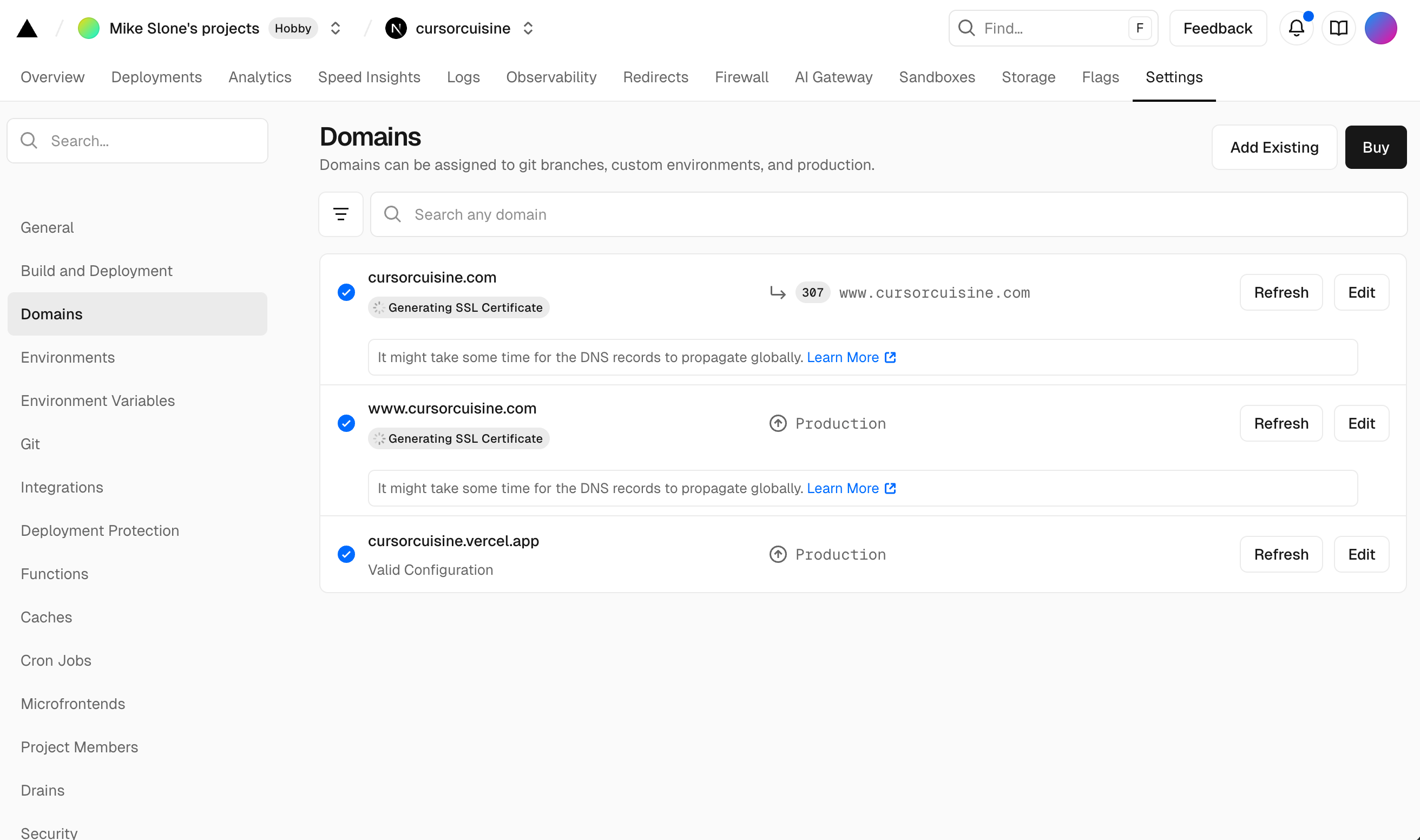 cursorcuisine.com.Vercel will give you two numbers (A Record and CNAME).
