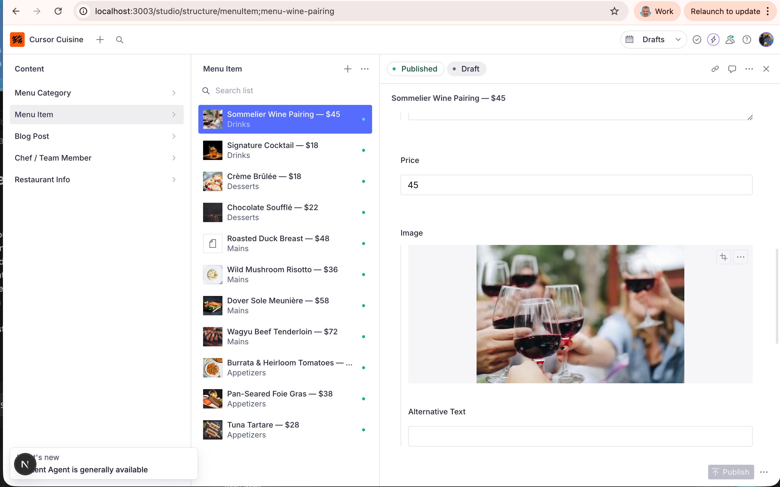 Test it: Go to Sanity, change the price of the “Wine Pairing” from $45 to $75. Hit Publish. Refresh your local website. Did it change? Success!