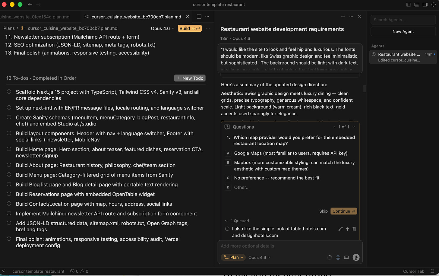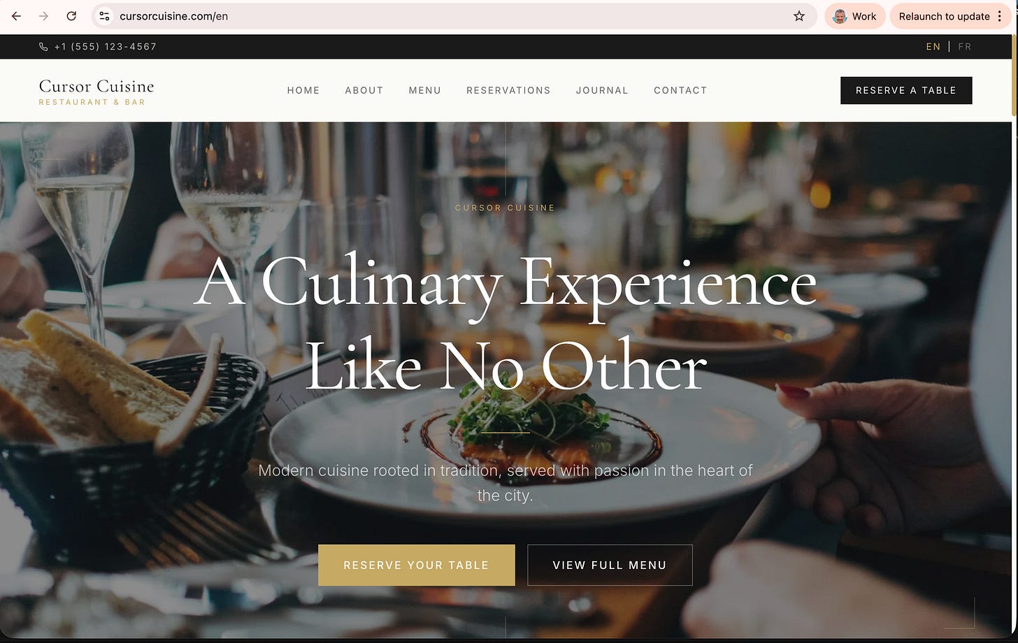 Today, I’m going to show you exactly how to build a sophisticated, multilingual restaurant website called Cursor Cuisine (live example: cursorcuisine.com) in under three hours. And the best part? You don’t need to know how to code. Not even a little bit.