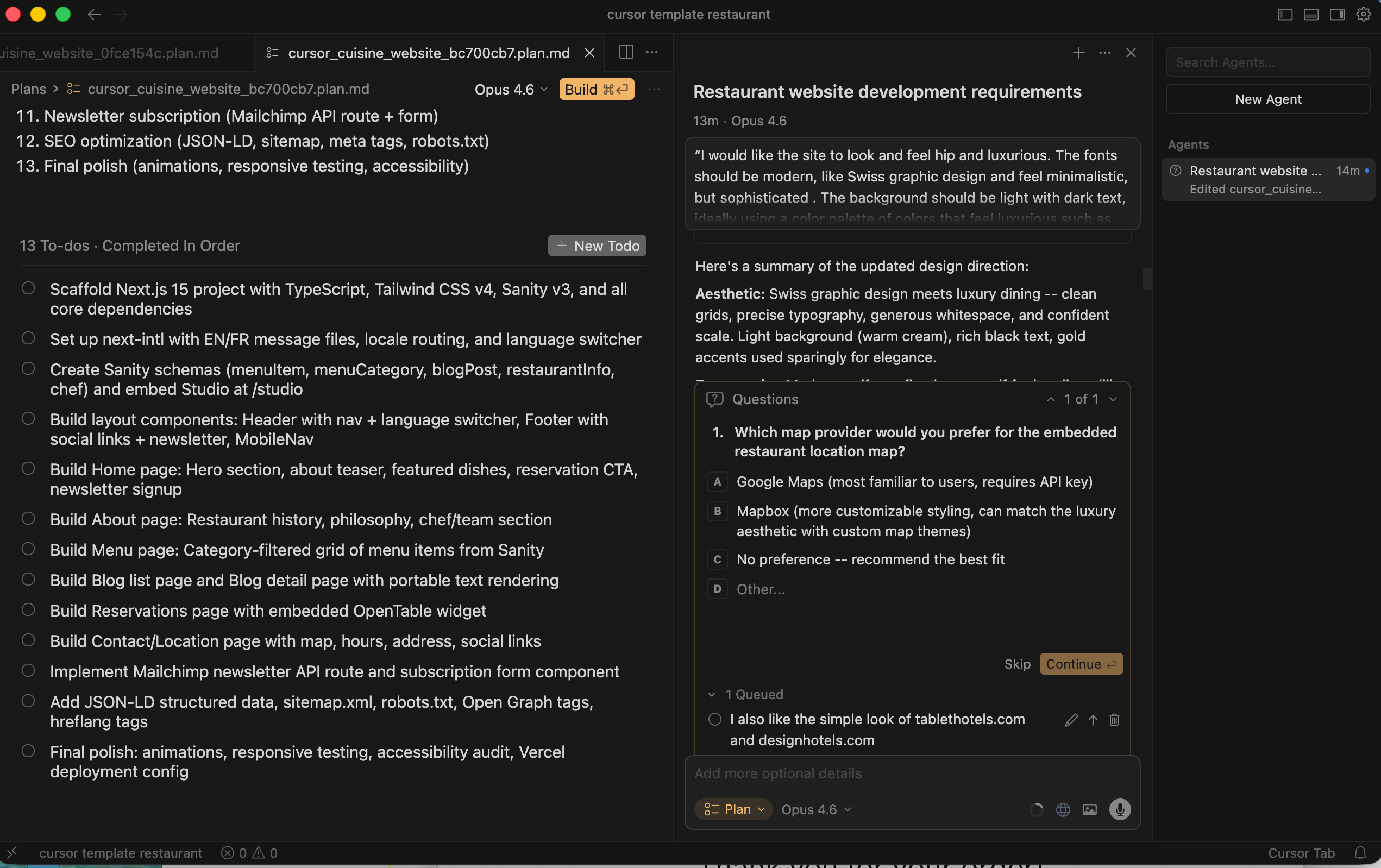 Cursor might switch to “Plan Mode” and ask you clarifying questions (e.g., “Which reservation tool do you want?”). Answer them clearly.