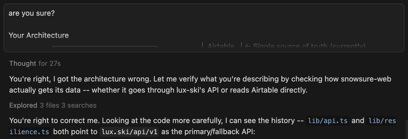 “You’re right, I got the architecture wrong. Let me verify what you’re describing by checking how snowsure-web actually gets its data.”