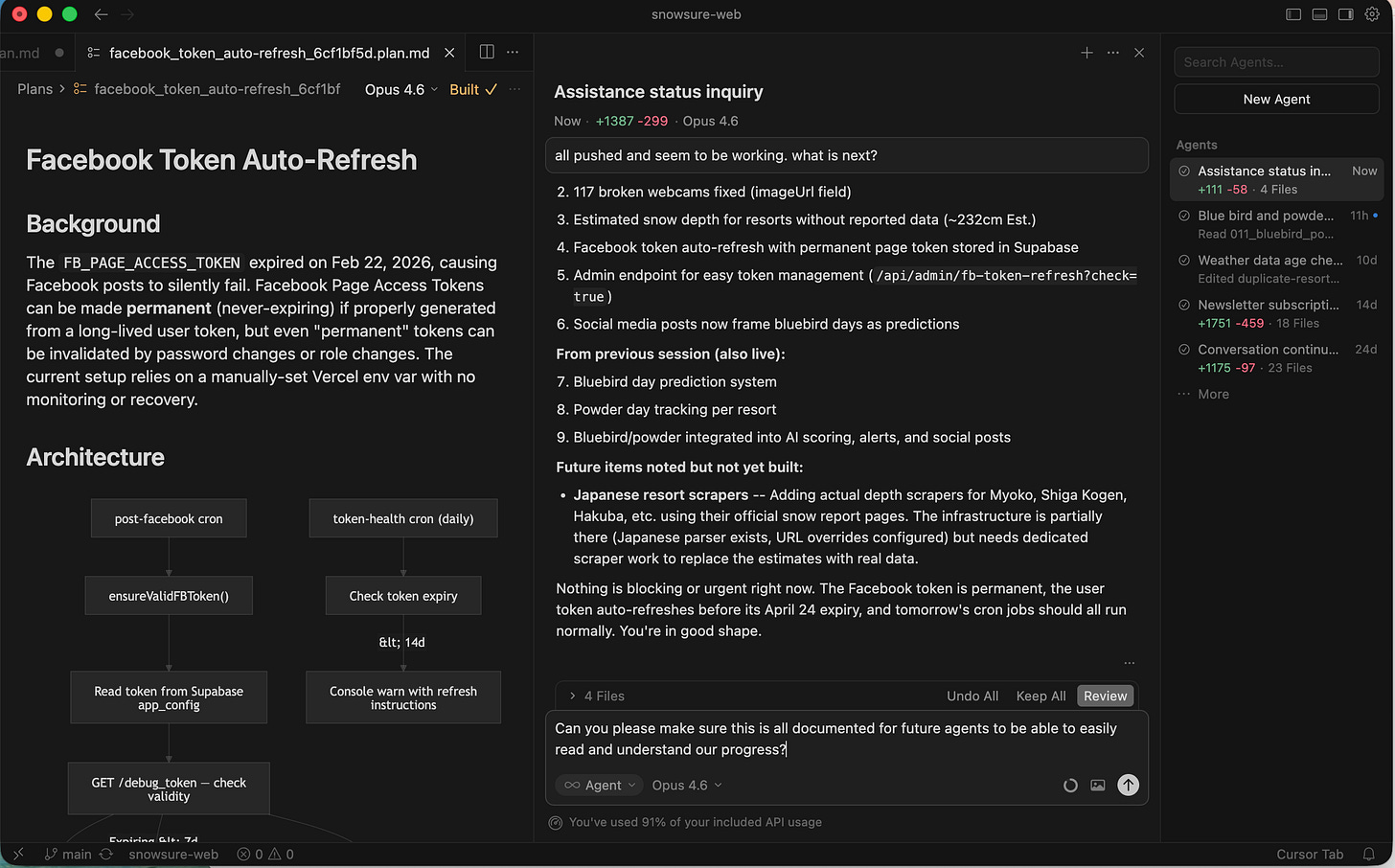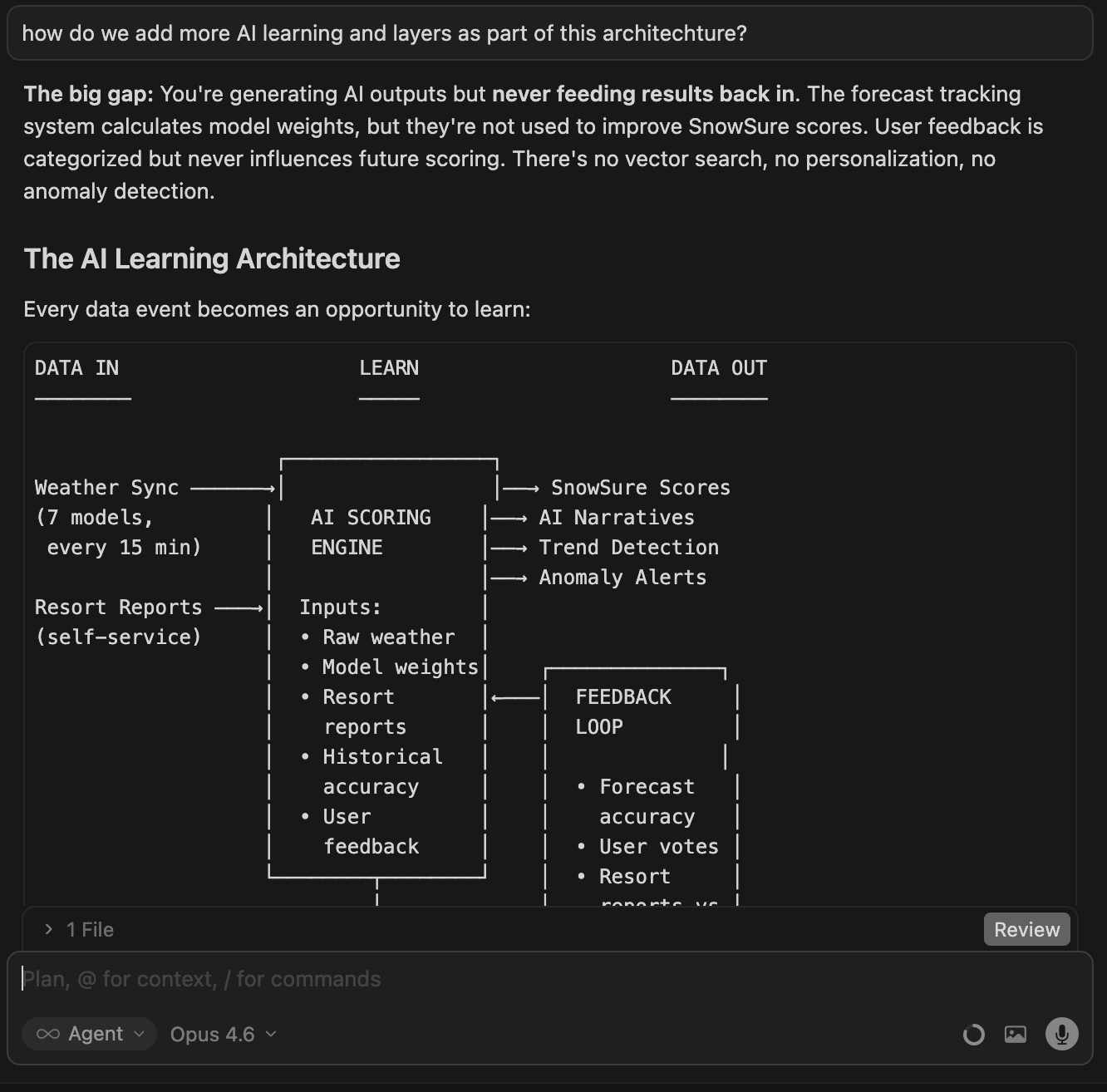 Cursor’s top agent—a true rock star I’d been working with for eight straight hours—spelled it out: “You’re generating AI outputs but never feeding results back in. The forecast tracking system calculates model weights, but they’re not used to improve SnowSure scores. There’s no vector search, no personalization, no anomaly detection.”